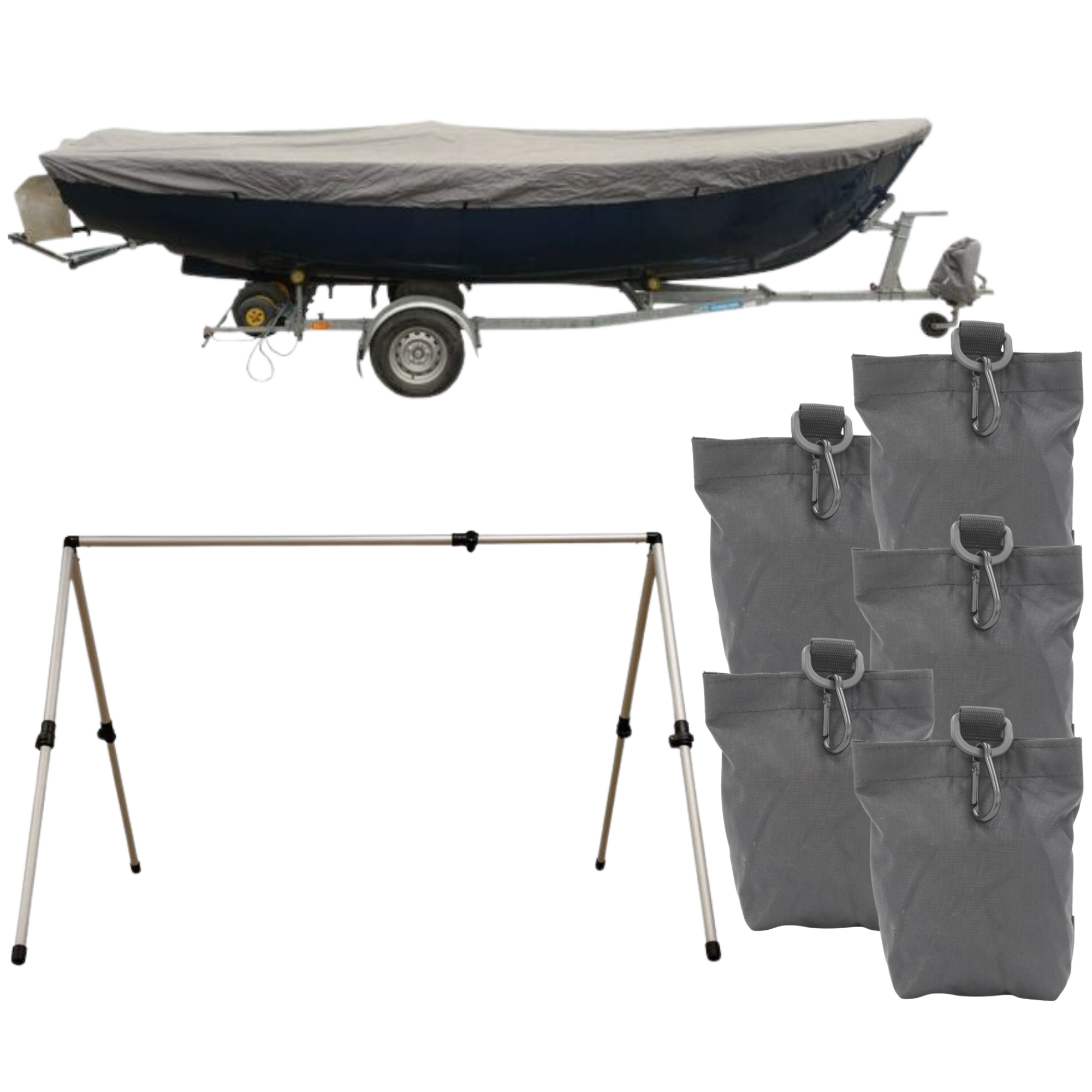 Avec une bâche de bateau 600D, un support de bâche et des sacs de sable.